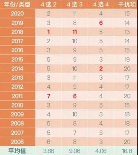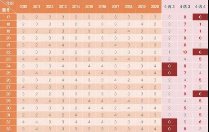 下表中,2010年縱向的數(shù)字分別為該年份每道題的答案類型:2代表4選2;3代表4選3;4代表4選4。通過該表不僅能清楚看到每年的答案類型情況,還可以直觀看到每道題在歷年真題中的答案類型數(shù)量統(tǒng)計(jì)。比如17道題在近11年真題中,4選2出現(xiàn)了3次,4選3出現(xiàn)了8次,沒有出現(xiàn)過4選4。