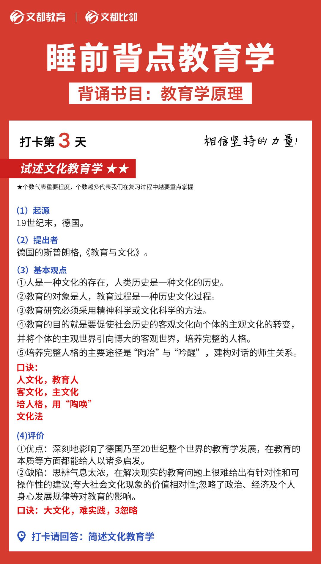 不管是公共課還是專業課,在你決定考研的那一刻,備考將是一場持久戰,每科的備考都將是一場默默無聞的蛻變!常言道:種一棵樹最好的時間就是現在。教育學考研啟程了,各位小耳朵們,陜西文都考研在此倡議:從今天開始,陜西文都考研將陪著所有考研小伙伴們一起,堅實地跨出第一步,第二步,第三步……從今天開始#教育學每日打卡#,日拱一卒,從最基礎的內容開始,文都考研小可愛陪你共進,不退,讓我們打卡教育學知識點吧。