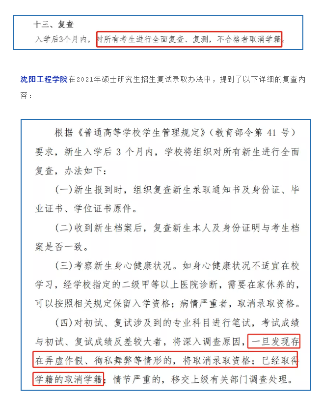 南開(kāi)大學(xué)在2021年碩士研究生復(fù)試辦法中明確表明:入學(xué)三個(gè)月后對(duì)所有考生進(jìn)行全面復(fù)查、復(fù)測(cè),不合格者取消學(xué)籍。
