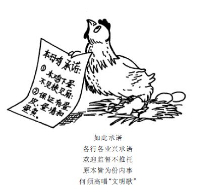 本文是一篇漫畫作文, 畫的寓意是“各行各業的種種承諾本應是自身的職責, 卻要大肆渲染, 無疑是多此一舉”, 其愚蠢程度不亞于圖中“ 母雞下蛋的承諾”。這類題型必須把握其寓意( hidden meaning) , 方能切中主題。本文第一段用兩句解釋了 漫畫, 其開頭不落俗套, 文筆幽默。第二段切入主題, 例舉各種“ 多此一舉”的承諾, 筆調生動, 最后一句是有力的揭露。結尾段 中引用了一句成語并奉勸承諾者不要像母雞那樣愚蠢本題曾是一次考研寫作題, 漫畫取自于21 世紀報, 作者借題自行撰文。
