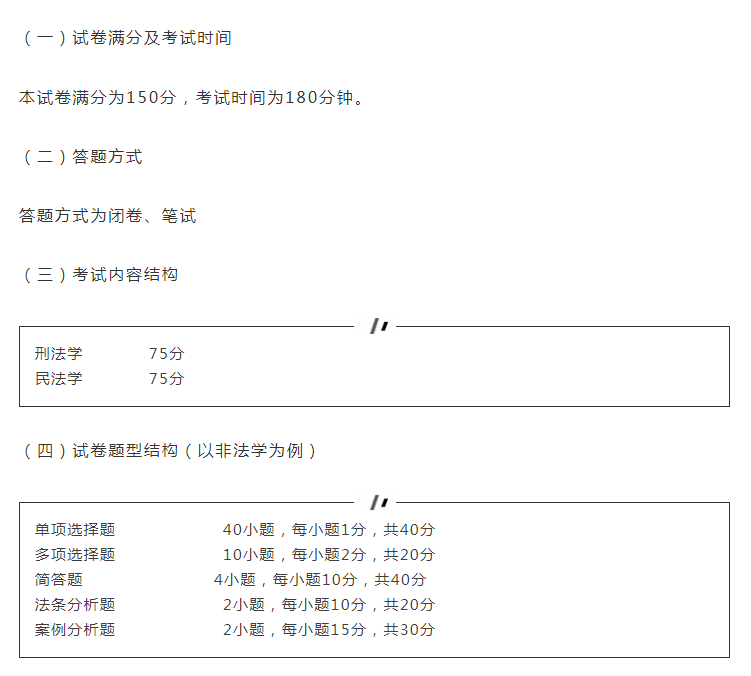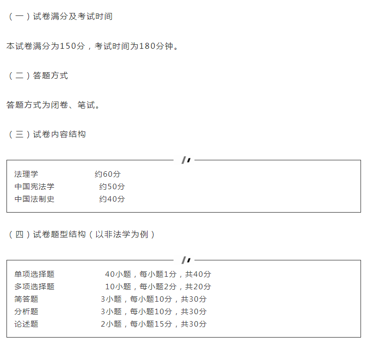 綜合課考試包括法理學、中國憲法學和中國法制史三部分,主要考查相關學科的基本概念、基本知識和基本原理,從理論法學的角度測試考生是否具備法律碩士專業學位培養目標所要求的知識、能力和素養。在考查考生對基本概念和基本理論的理解及掌握的同時,側重考查考生綜合運用法學知識及原理分析、解決實際問題的能力和運用法律語言的表達能力。考生應能: