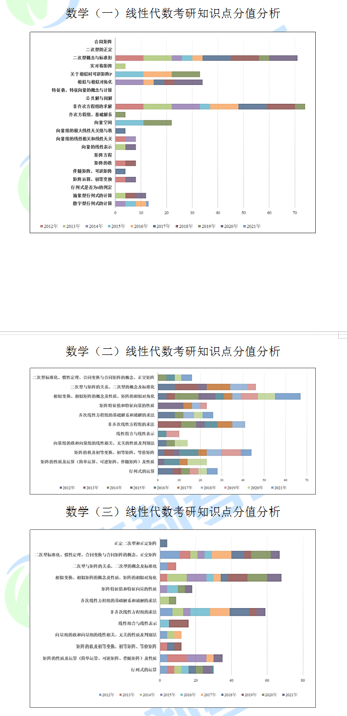 以上三個圖表分別是數學一,數學二和數學三中線性代數的知識點分布圖。可以發現這些題型都是常考題型,也能夠看出來有些題型在近十年中考頻較高,有些題型相對低,而這些相對低的題型正有可能是今年要考的題型。所以,文都考研的老師們提醒大家在復習的時候一定要做到全面到位。預祝大家在2023年研究生考試中成功!