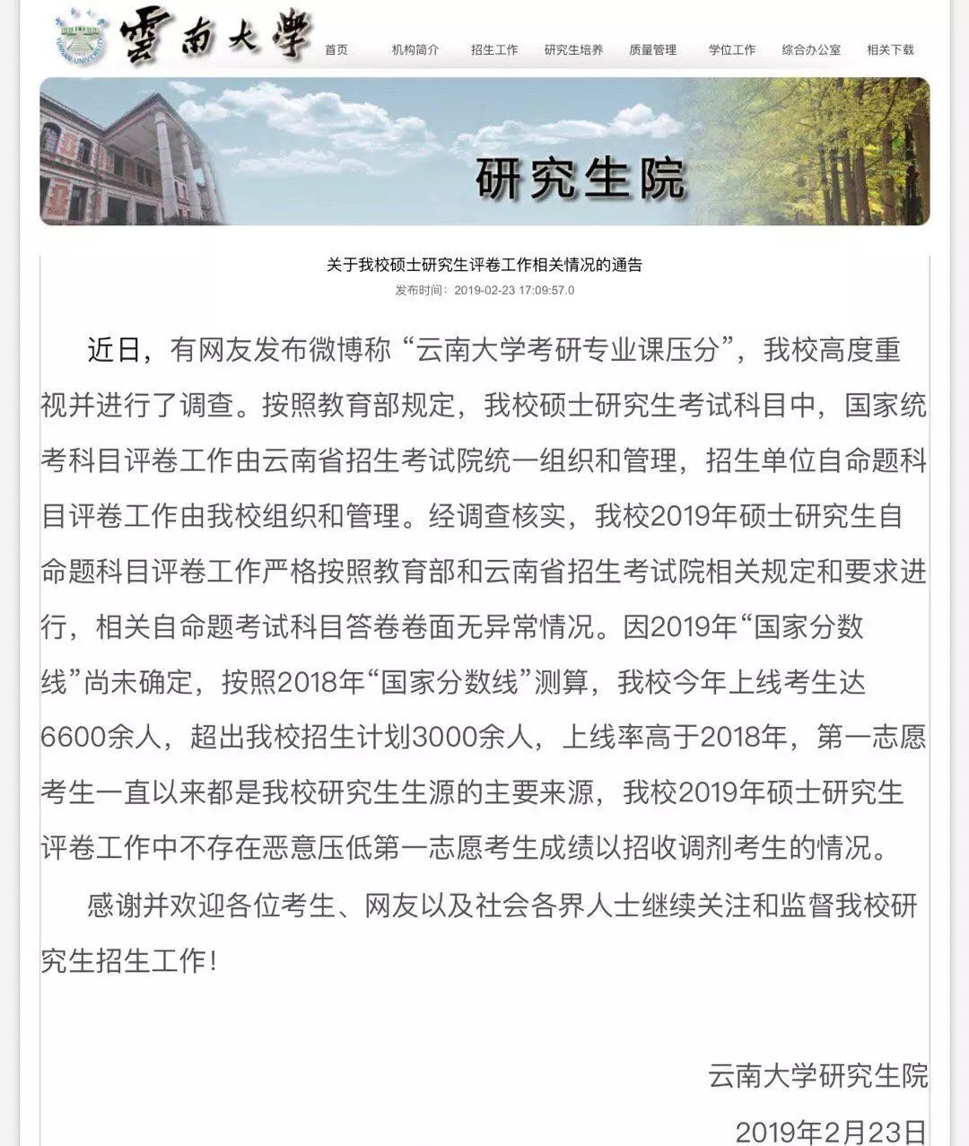 如果,它的生源過線率明顯比去年高,且這個學校并沒有明顯的擴招,那么國家線上漲可能要大,不然,它就只能增加復試難度。剛剛好,云南大學因為xx師范大學的壓分熱搜時間,躺槍了一把,發了這樣的公告: