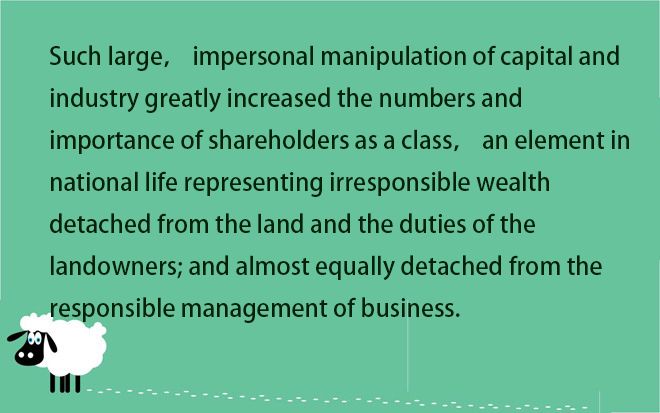 【譯文】對資本和企業(yè)的這種大規(guī)模的非個人操縱大大增加了股東作為一個階級的數量和重要性。這個階層作為國計民生的一部分,代表了非個人責任的財富與土地及土地所有者應盡義務的分離,而且也幾乎與責任管理相分離。