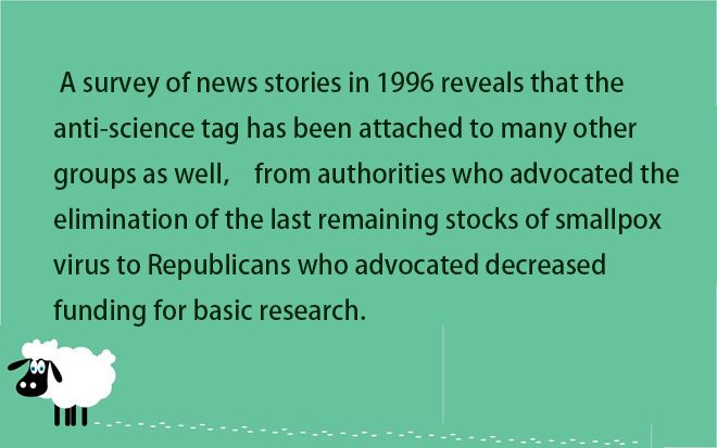 【譯文】一項關于1996年的新聞故事的調查顯示,很多其他組織也被貼上了反科學的標簽,比如提倡消滅最后一批儲存的天花病毒的機構和某些提議削減基礎研究資金的共和黨人。