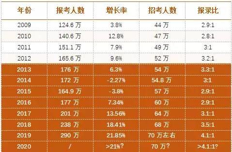 從2017年非全日制考研納入全國統一考試開始,考研人數就發生了爆炸式的增長。2017年考研人數201萬,2018年考研人數238萬,到2019年考研人數為290萬,按照這個趨勢發展,2020年人數突破300萬應該不成問題。