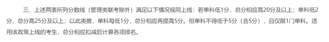 若單科低1分,總分相應高20分及以上;單科低2分,總分高25分及以上;以此類推,單科每低1分,總分相應再提高5分。但單科不得低于5分(含5分),且僅限1門單科。適用該政策上線的考生,總分相應扣減后計算各項排名。