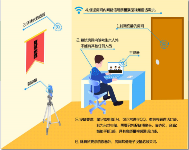 復試過程中,連接登錄復試系統的設備不允許再運行其他網頁或軟件,設備須處于免打擾狀態,保證復試過程不受其他因素干擾或打斷,不得與外界有任何音視頻交互,復試房間其他電子設備必須關閉。