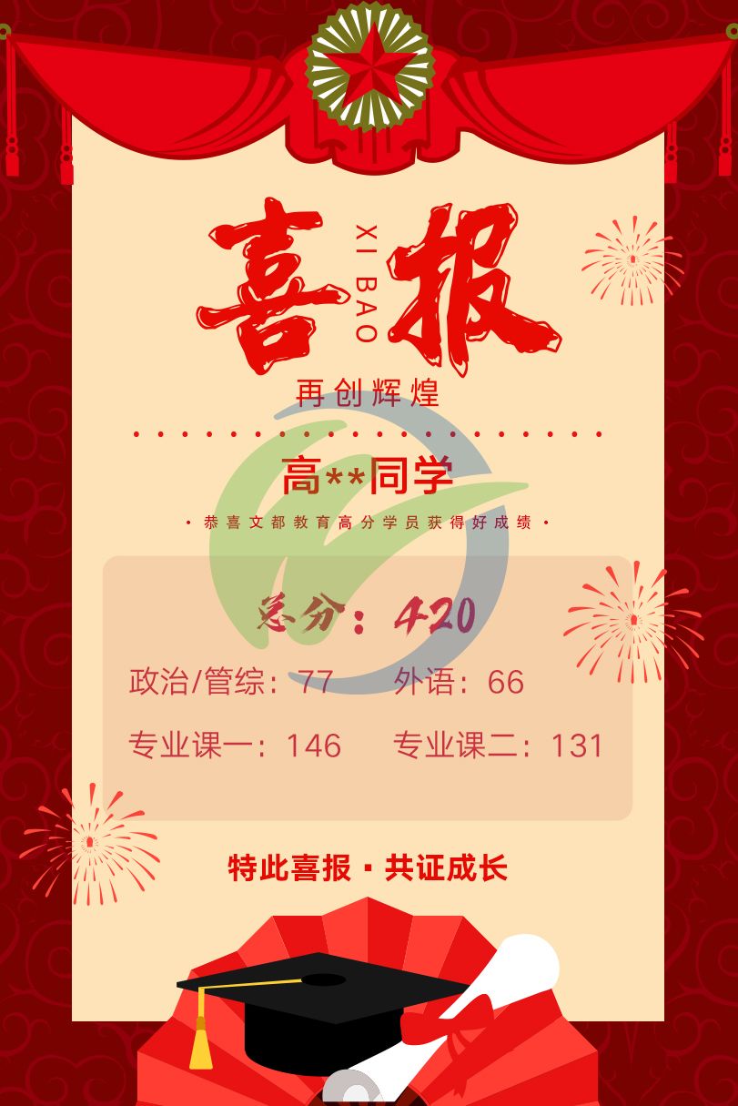 考研初試成績已經出來啦,文都學子喜報頻傳,文都老師快被大家的私信給淹沒啦,數三滿分的答卷,藝考滿分的手繪卷,管綜的高分,不得不說這屆學員真的太優秀了!所有的付出和努力,吃過的苦,熬過的夜都作數,不必羨慕別人的分數,從最細微處做起,明年的高分榜一定有你。接下來一起看看我們文都考研優秀的學子的初試捷報吧。
