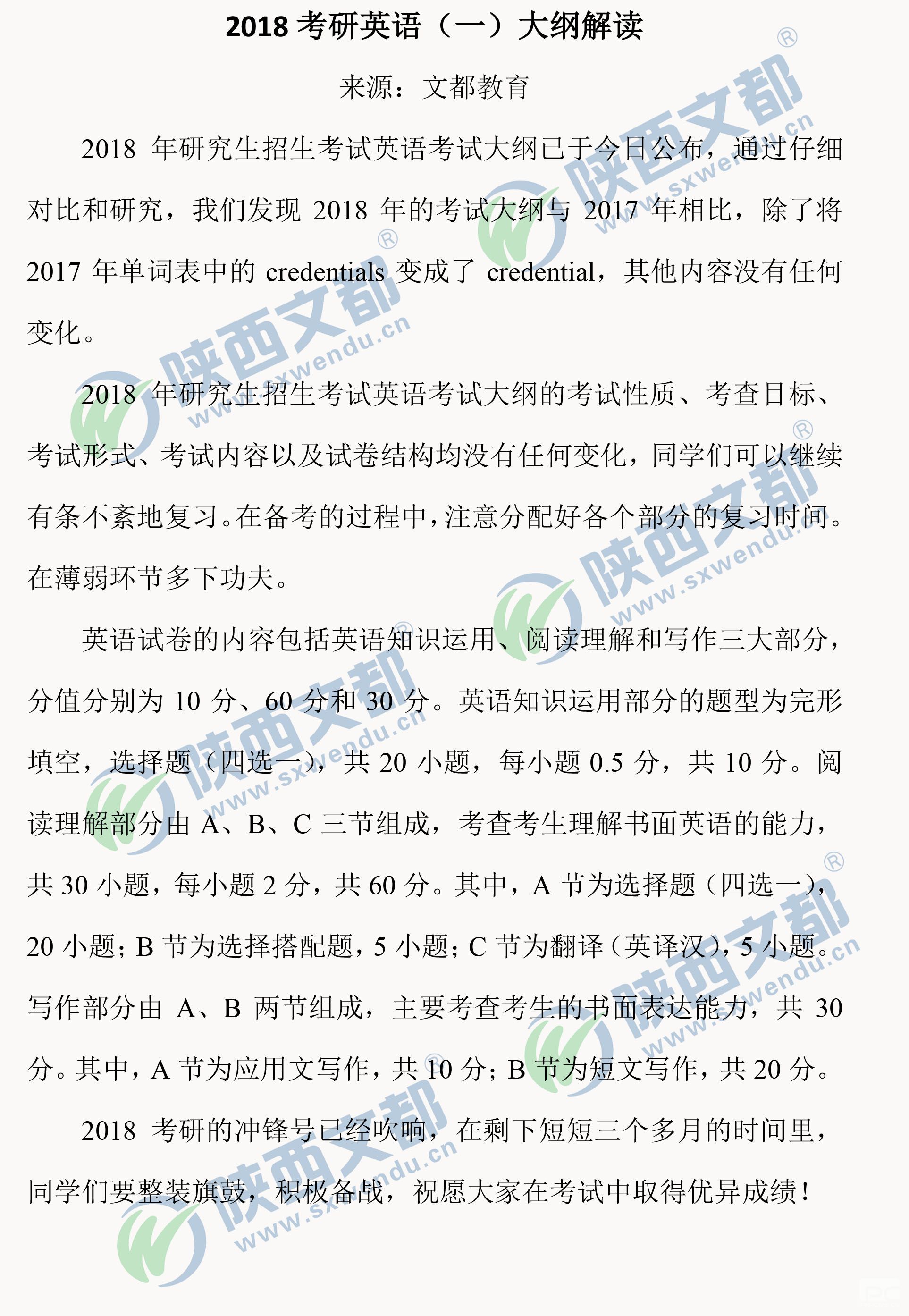 2018年研究生招生考試英語考試大綱的考試性質、考查目標、考試形式、考試內容以及試卷結構均沒有任何變化,同學們可以繼續有條不紊地復習。在備考的過程中,注意分配好各個部分的復習時間。在薄弱環節多下功夫。