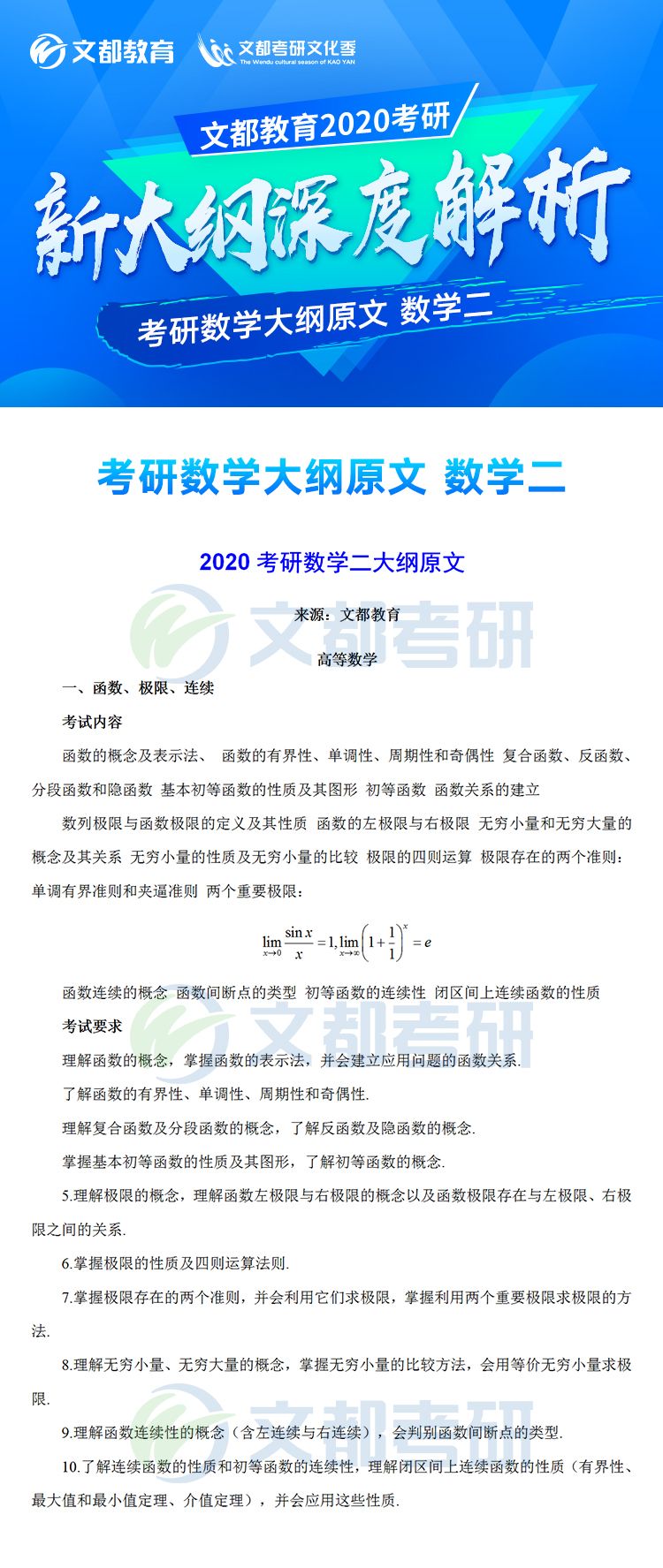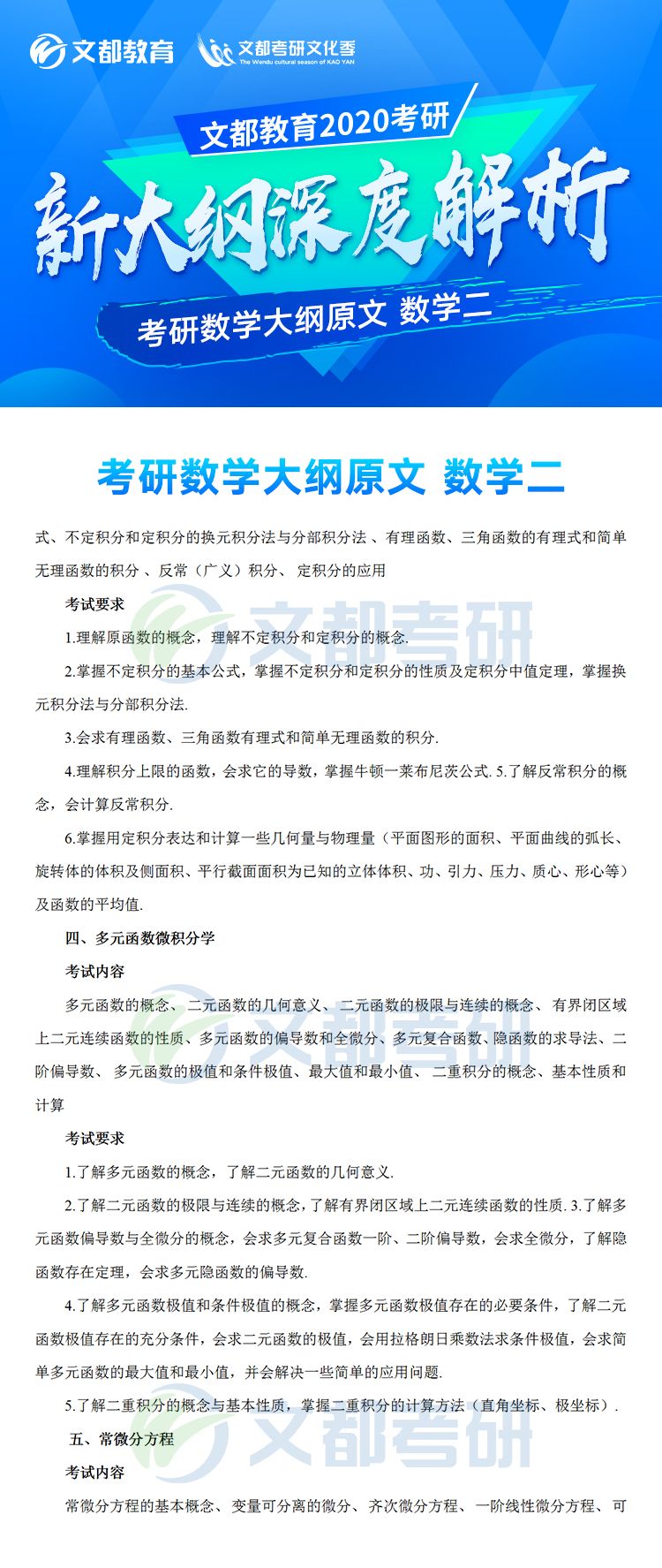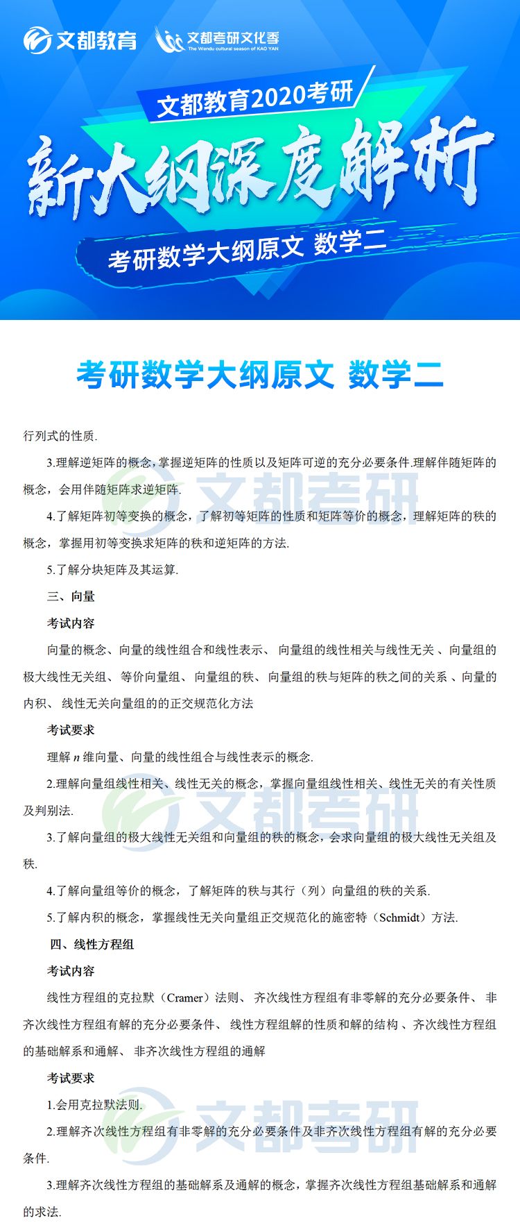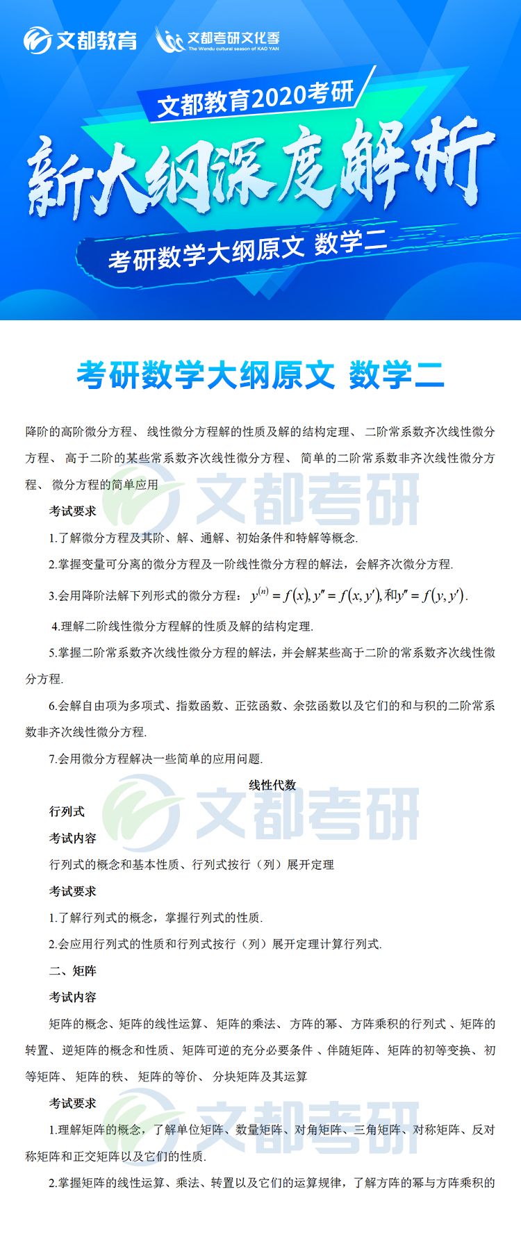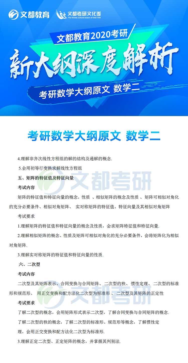 2020年全國碩士研究生招生考試各科目考研大綱已于7月8日發(fā)布,對于考生來說這是非常好的消息,有充足的時間根據(jù)新的大綱知識點進行專業(yè)課復(fù)習(xí),考研數(shù)學(xué)大綱對參加研究生考試的考生考研數(shù)學(xué)復(fù)習(xí)具有指導(dǎo)意義,它可以有效矯正考生復(fù)習(xí)方向偏差的問題,讓復(fù)習(xí)方向化零為整,提高效率。。如果你還不清楚,不妨看看2020年全國碩士研究生招生考試數(shù)學(xué)考試大綱(數(shù)學(xué)二)的文章,如有需要及時加入陜西文都20考研交流群, 陜西文都考研網(wǎng)持續(xù)為您提供考研所需的相關(guān)指導(dǎo)信息。20考研資料共享:【互動可加群】丨官方網(wǎng)站【@陜西文都考研】