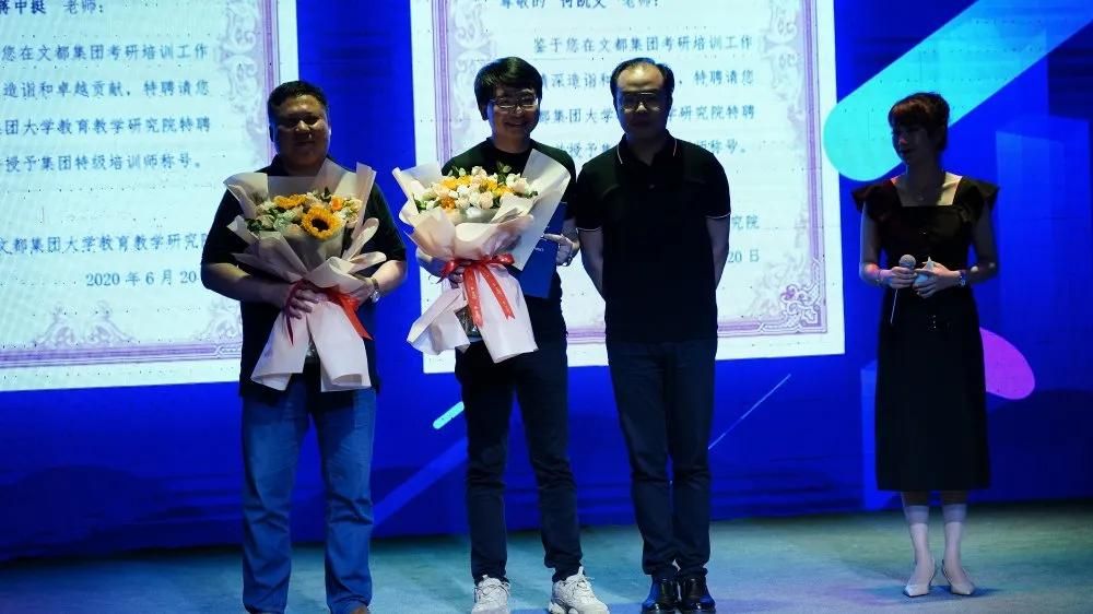 在盛典現場,文都集團為表達對兩位名師無私奉獻的感謝,特進行了特殊環節,由集團大學教育教學研究院院長萬磊老師為何凱文老師、蔣中挺老師頒發“文都教研院特級培訓師”聘書,這份感謝,既是榮譽,亦是責任。未來,文都教師團隊必將繼續助力更多考研學子圓夢高校。