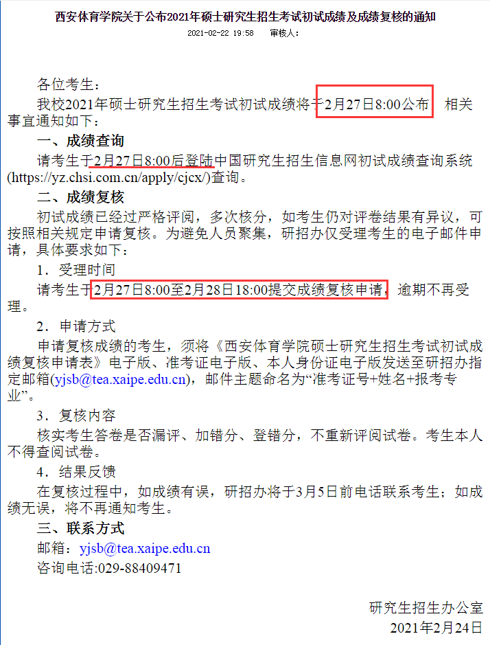 西安體育學院2月24日發布2021年研究生招生考試初試成績查詢公告。