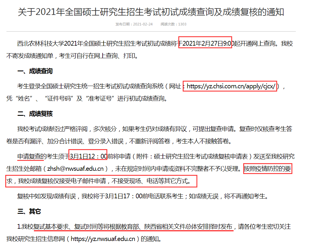 西北農林科技大學2021年全國碩士研究生招生考試初試成績將于2021年2月27日9:00起開通網上查詢。我校不寄發成績通知單,考生可自行在網上查詢、打印。