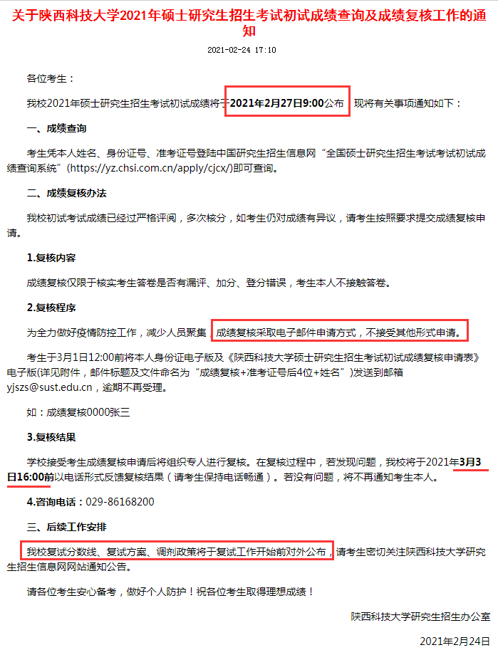 我校復試分數線、復試方案、調劑政策將于復試工作開始前對外公布,請考生密切關注陜西科技大學研究生招生信息網網站通知公告。