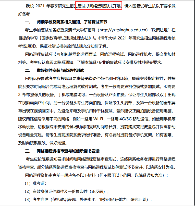 清華大學2021年碩士研究生招生考試以網(wǎng)絡(luò)遠程復試為主