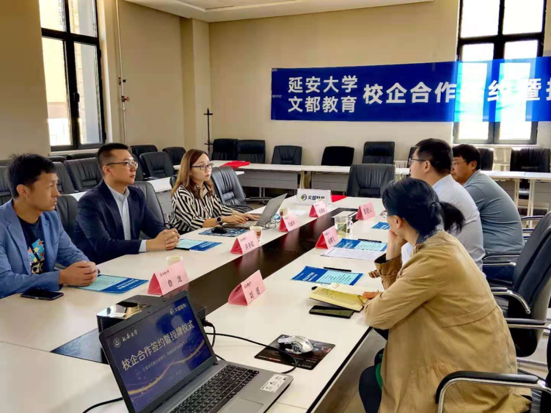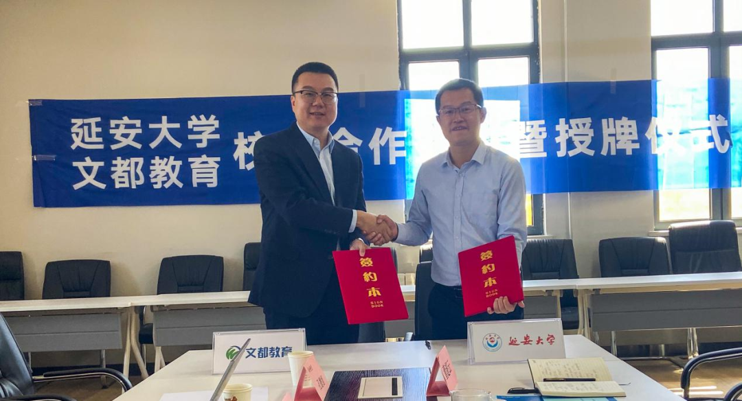 5月27日,文都教育與延安大學簽訂校企合作協議,共同致力于大學生能力提升。延安大學學工部副部長趙鵬飛,文都集團總校長助理侯冬超參加簽約儀式。