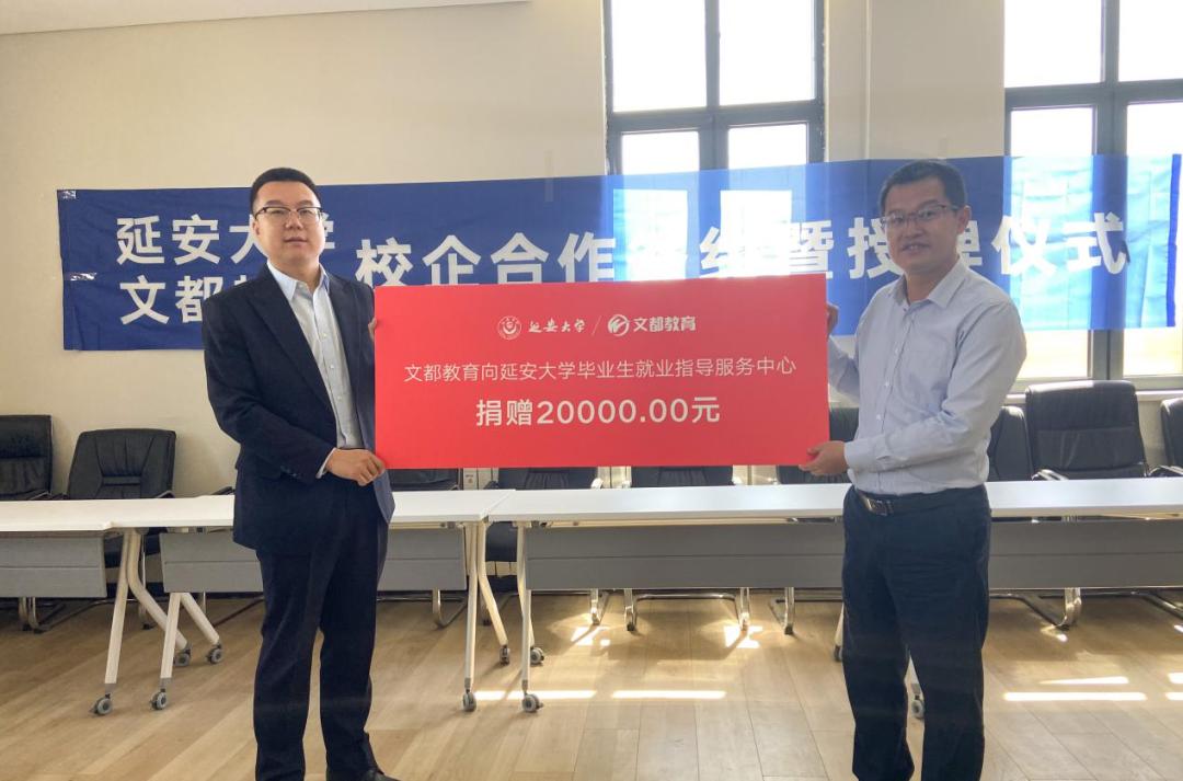 在簽約儀式結束后,文都教育向延安大學創就業指導中心捐贈20000元,用于為延安大學“考研互助班”的學子提供學習資源及獎學金,貫徹文都公益“溫度計劃”精神,落實文都“教育讓生命更美好”的使命。