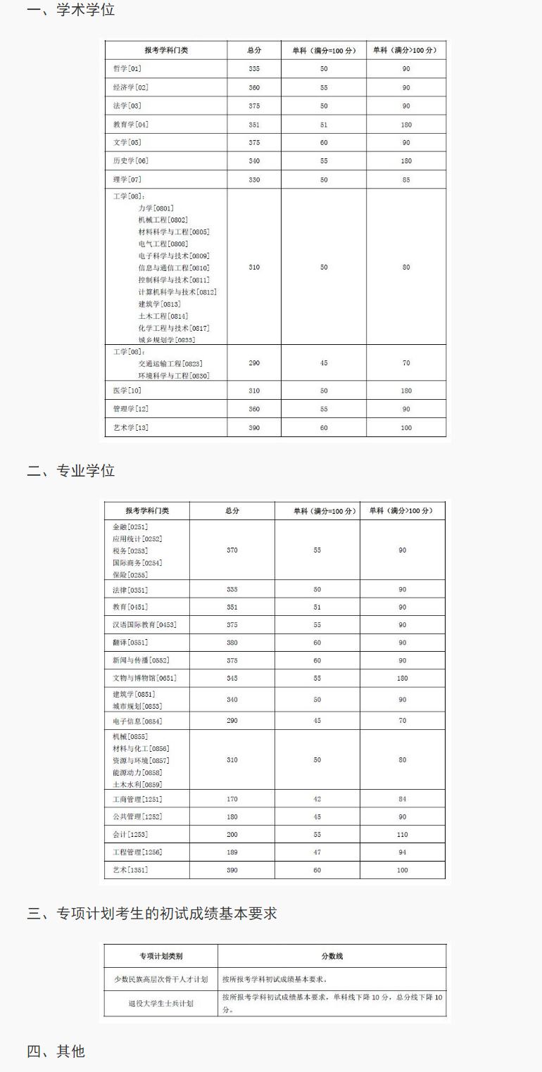 1.以上為考生進入我校復試的初試成績基本要求,各學院可根據招生計劃、生源情況、學科專業特點等,向上調整復試分數線。
