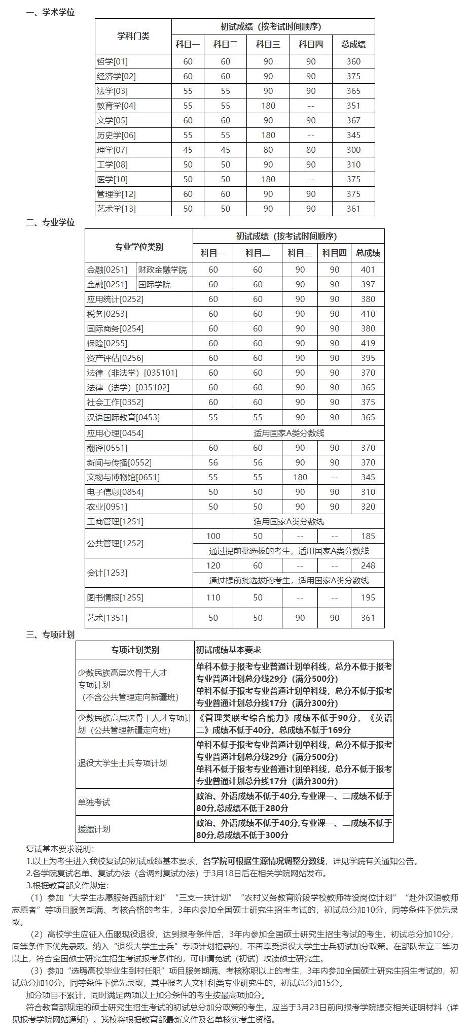 中國人民大學(xué)2022年碩士研究生招生復(fù)試基本分數(shù)線