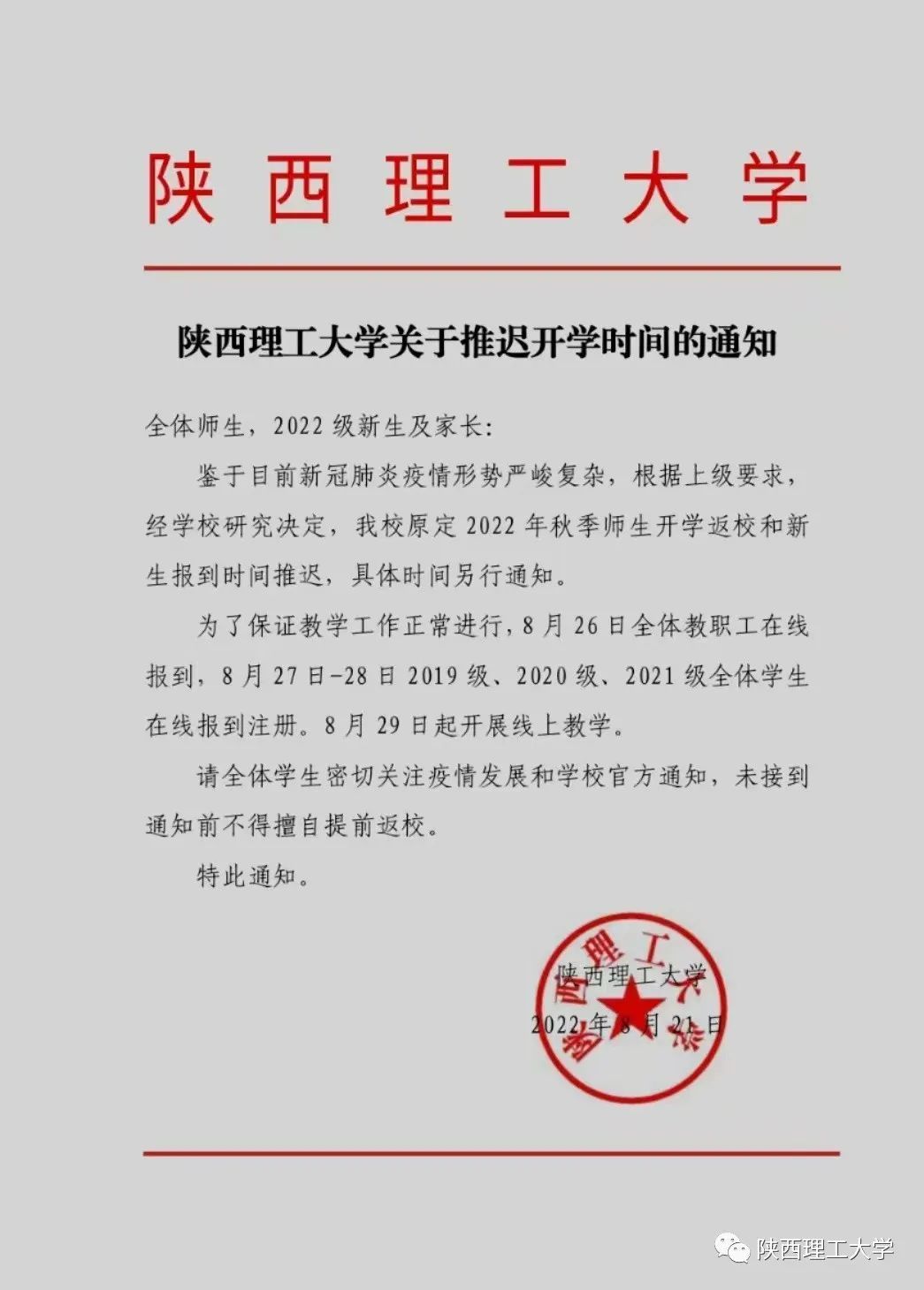 陜西理工大學關于推遲開學時間的通知