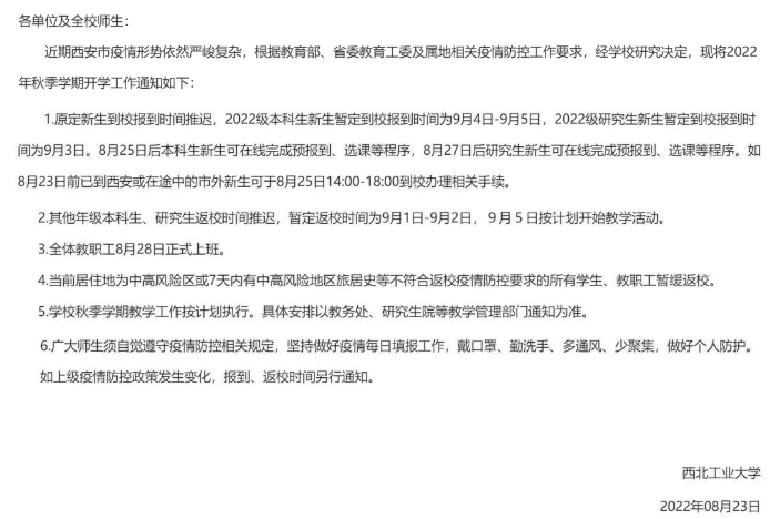 西北工業大學關于做好2022年秋季學期開學工作的通知