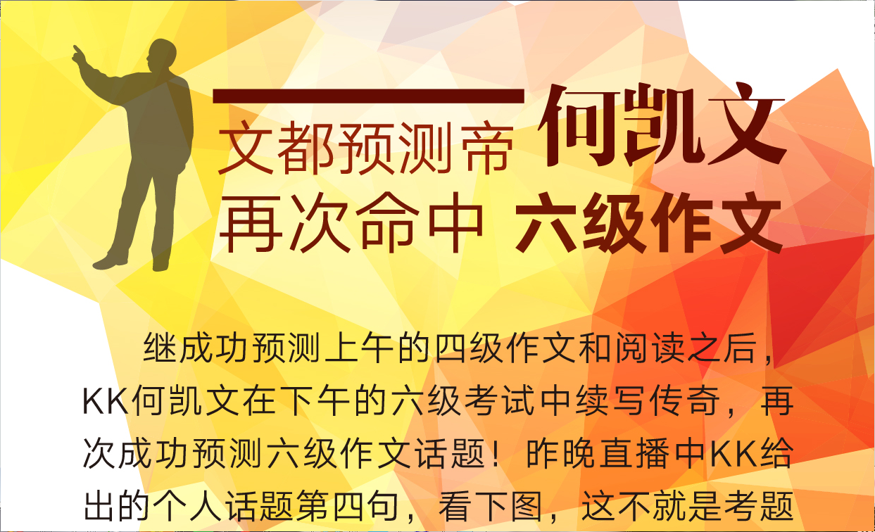 2018年12月大學(xué)英語四六級考試剛剛結(jié)束,繼成功預(yù)測上午的四級作文和閱讀之后,kk何凱文在下午的六級考試中續(xù)寫傳奇,再次成功預(yù)測六級作文話題!跟著文都四六級來看看下圖!!
