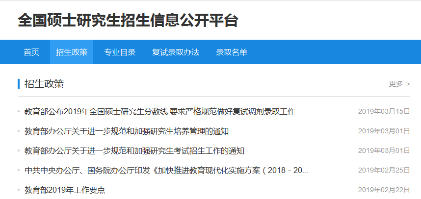 ??首先,我們可以看到總共有四個(gè)大欄目,招生政策、專業(yè)目錄、復(fù)試錄取辦法以及錄取名單。