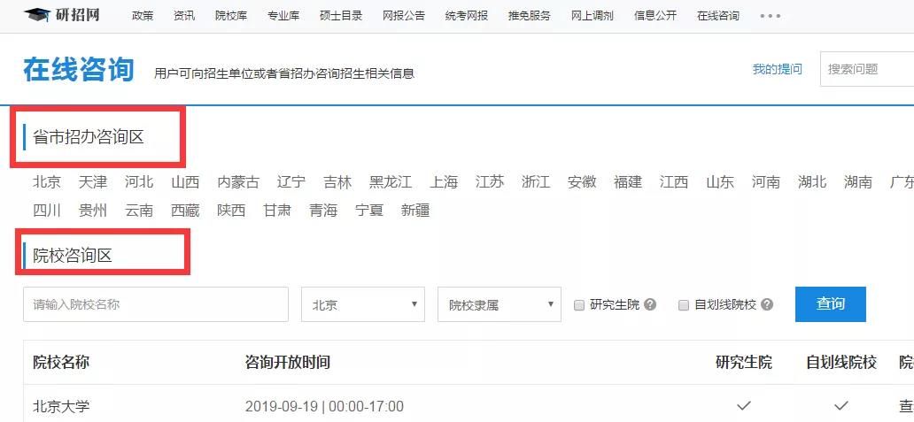 本月19日-23日,在研招網(wǎng),各招生單位會在既定的時間段為大家在線答疑。咨詢入口見下圖: