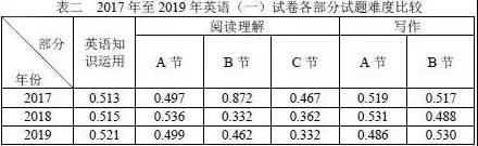 從以上表格可以看出,2017年-2019年英語二的試卷中,閱讀理解部分和寫作部分難度整體穩定,翻譯部分難度較前兩年略微提高,但是,A節要稍難于往年,B節比往年稍易。
