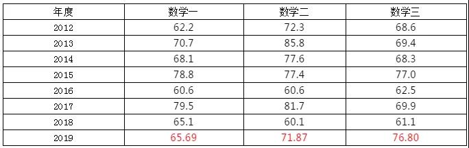 數學一65.69 難度系數0.438 難度偏大數學二71.87 難度系數0.479 難度略大數學三76.80 難度系數0.512 難度適中