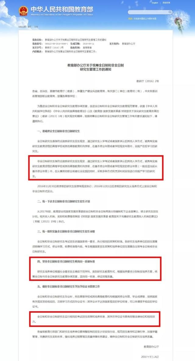 2016年9月14日教育部辦公廳發布了《教育部辦公廳關于統籌全日制和非全日制研究生管理工作的通知》,文件明確指出“堅持全日制和非全日制研究生教育同一質量標準。”