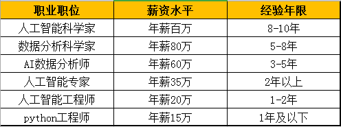 2018年python、大數(shù)據(jù)、人工智能從業(yè)者薪資數(shù)據(jù)顯示,北上廣三地的平均薪資水平分別為29036元、25163元和23036元,年薪幾十萬甚至百萬。人工智能是未來的發(fā)展方向,國家政策也在強(qiáng)力扶持,可以說學(xué)人工智能類專業(yè)就相當(dāng)于捧上了“金飯碗”。