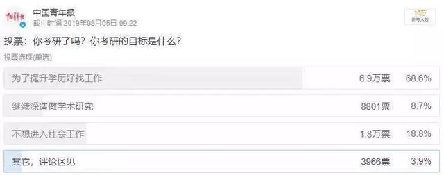 中國青年報曾在微博發起投票,將近七成網友覺得考研是為了提升學歷,進而好找工作。