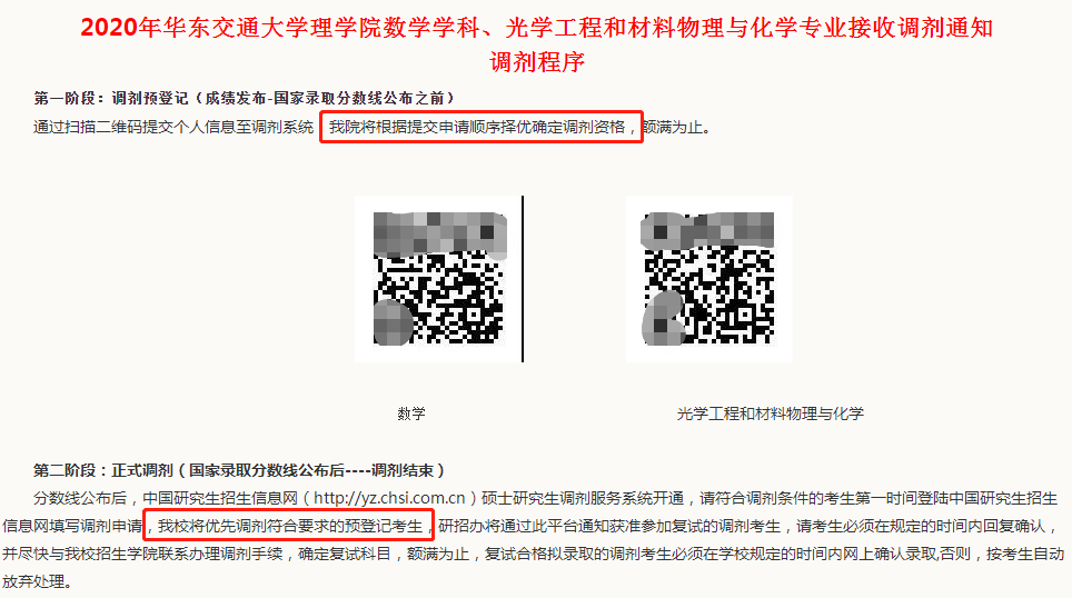 華東交通大學理學院接收數學學科、光學工程和材料物理與化學專業預調劑通知中提到:分數線公布后,研招網調劑服務系統開通,請符合調劑條件的考生第一時間登陸研招網填寫調劑申請,我校將優先調劑符合要求的預登記考生。
