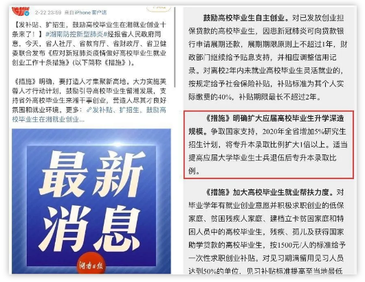 2月22日,湖南省人社廳、省教育廳、省財政廳、省衛(wèi)健委聯(lián)合發(fā)布《應對新冠肺炎疫情做好高校畢業(yè)生就業(yè)創(chuàng)業(yè)工作十條措施》,其中一條為,明確擴大高校畢業(yè)生升學深造規(guī)模,2020年全省增加5%研究生招生計劃。