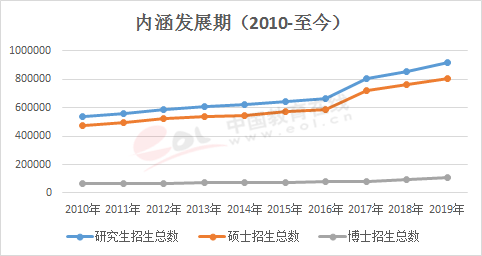 (2010年至今,研究生招生規模增長速度整體有所放緩,研究生教育由外延式擴張階段逐步向內涵式發展階段轉變。1978年到2019年的四十一年間,研究生教育快速發展,招生人數累計達到1084萬人,其中碩士研究生約943萬人。)