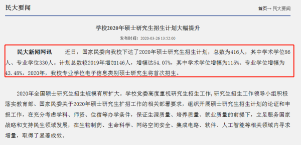 近日,國家民委向我校下達了2020年碩士研究生招生計劃,總數(shù)為416人,其中學術學位86人、專業(yè)學位330人。計劃總數(shù)較2019年增加146人,增幅達54.07%,其中學術學位增幅為115%、專業(yè)學位增幅為43.48%。2020年,我校專業(yè)學位電子信息類別碩士研究生將首次招生。