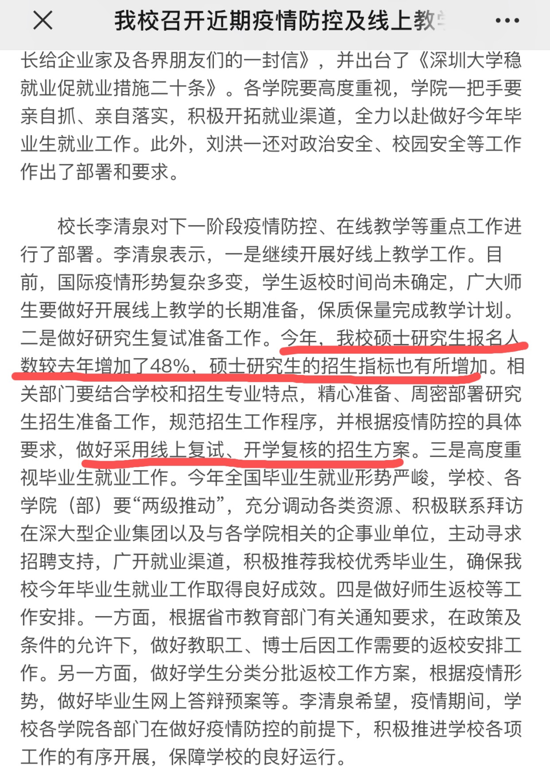表示今年考研報名人數較去年增加了48%,碩士研究生的招生指標也有所增加,但未給出具體的數據,小編猜想可能比例不高。同時,深大對于復試表示要做好采用線上復試、開學復核的方案,但沒有具體指出開學復核什么方面以及復核不過怎么辦,同時小編也沒理解這個開學是指新生入學還僅僅是說本學期學生返校。