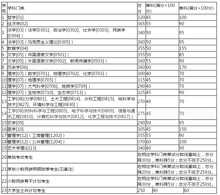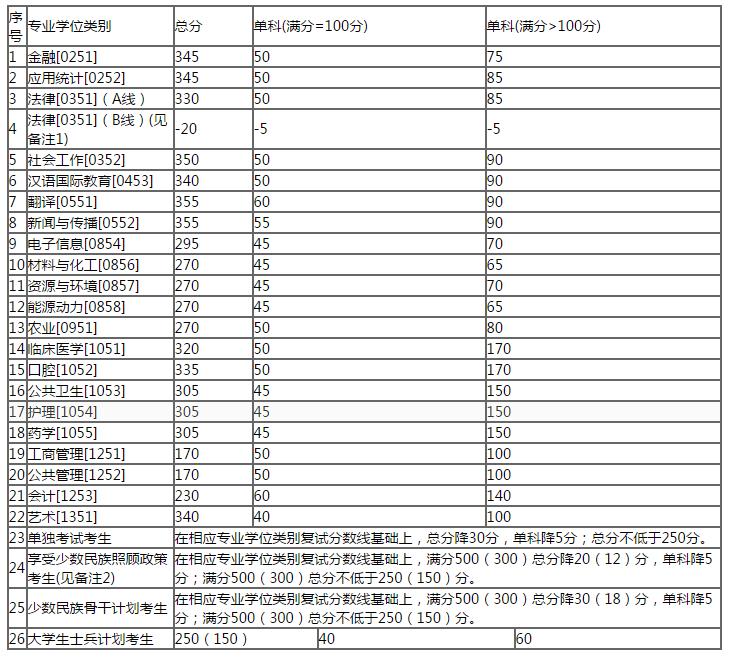 備注:1.B線適用范圍:第一志愿報(bào)考我校法律(法學(xué))、法律(非法學(xué))專業(yè),且本科畢業(yè)4年(同等學(xué)力考生畢業(yè)6年)及以上(畢業(yè)信息以網(wǎng)報(bào)信息為準(zhǔn))的考生。滿足B線要求的考生須向報(bào)考學(xué)院書面申請(qǐng)并經(jīng)報(bào)考學(xué)院審核同意后方可參加復(fù)試。2.享受少數(shù)民族照顧政策的考生是指:報(bào)考我校、申請(qǐng)定向國(guó)務(wù)院公布的民族自治地方就業(yè)且戶籍在以上地區(qū)的少數(shù)民族考生。
