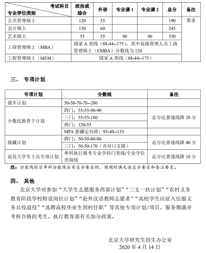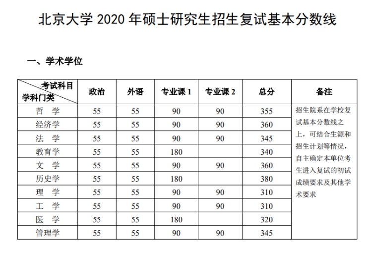 北京大學(xué)2020年碩士研究生招生復(fù)試基本分?jǐn)?shù)線