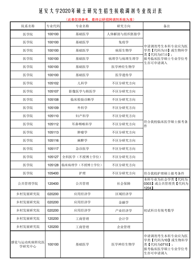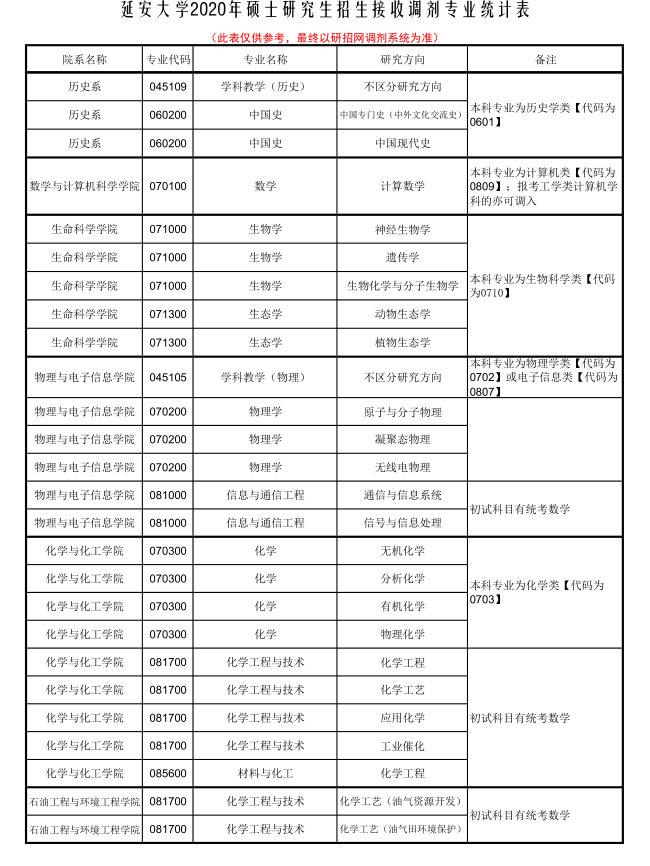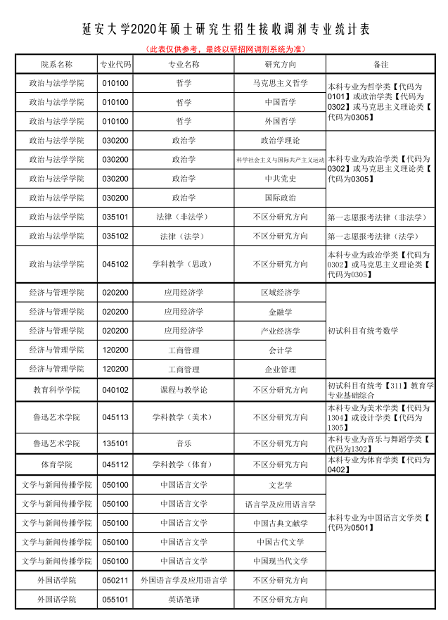 延安大學(xué)2020年碩士研究生招生擬接收調(diào)劑專業(yè)統(tǒng)計(jì)表