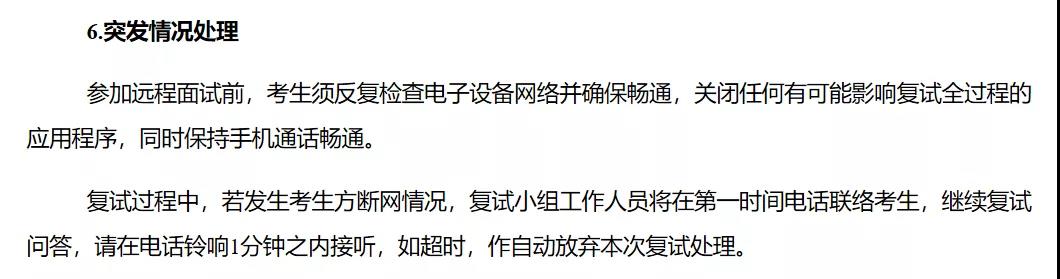 復試過程中,若發生考生方斷網情況,復試小組工作人員將在第一時間電話聯絡考生,繼續復試問答,請在電話鈴響1分鐘之內接聽,如超時,作自動放棄本次復試處理。