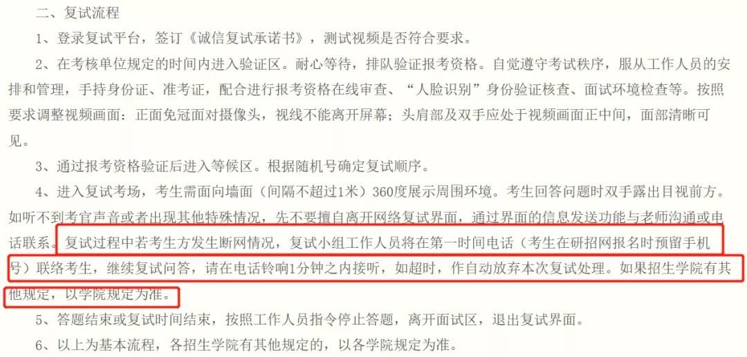 復試過程中若考生方發生斷網情況,復試小組工作人員將在第一時間電話(考生在研招網報名時預留手機號)聯絡考生,繼續復試問答,請在電話鈴響1分鐘之內接聽,如超時,作自動放棄本次復試處理。如果招生學院有其他規定,以學院規定為準。