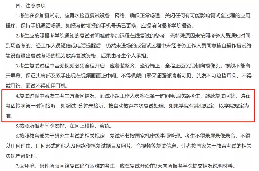 復試過程中若發生考生方斷網情況,復試小組工作人員將在第一時間電話聯絡考生,繼續復試問答,請在電話鈴響1分鐘之內接聽,如超時,作自動放棄本次復試處理。如果院系有其他規定,以院系規定為準。