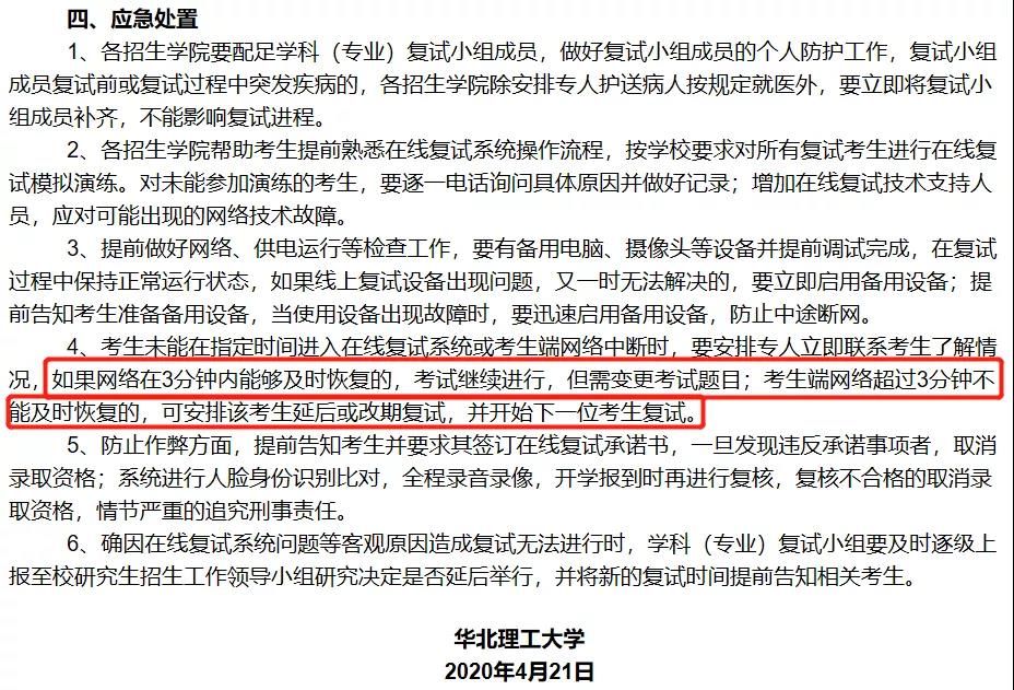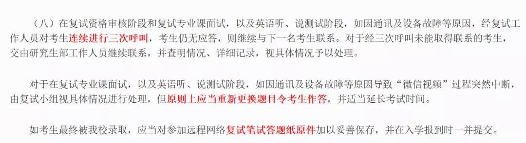 對于在復試專業課面試,以及英語聽、說測試階段,如因通訊及設備故障等原因導致“微信視頻”過程突然中斷,由復試小組視具體情況進行處理,但原則上應當重新更換題目令考生作答,并適當延長考試時間。