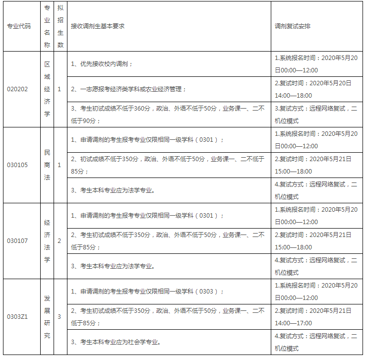 中國農(nóng)業(yè)大學區(qū)域經(jīng)濟學、民商法學、經(jīng)濟法學、發(fā)展研究專業(yè)調(diào)劑系統(tǒng)報名時間:5月20日00點-12點,每次開放持續(xù)時間不低于12個小時。