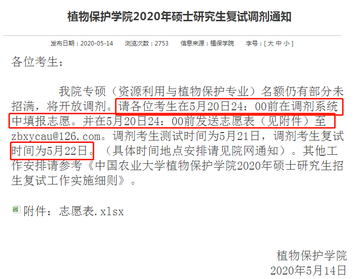 考生回復確認后,方可進行復試。復試方式為遠程網(wǎng)絡復試,請?zhí)崆皽蕚浜孟嚓P設備、場地等。植物保護學院請各位考生在5月20日24:00前在調(diào)劑系統(tǒng)中填報志愿。并在5月20日24:00前發(fā)送志愿表(見附件)至規(guī)定郵箱。調(diào)劑考生測試時間為5月21日,調(diào)劑考生復試時間為5月22日。