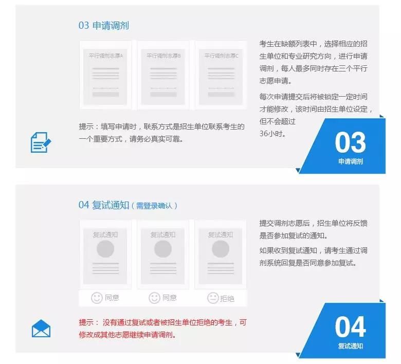 考生如果收到招生單位發(fā)送的復(fù)試通知,須在招生單位規(guī)定的時間內(nèi)回復(fù)是否同意參加復(fù)試。復(fù)試沒有通過的考生仍可繼續(xù)填報其他調(diào)劑志愿。