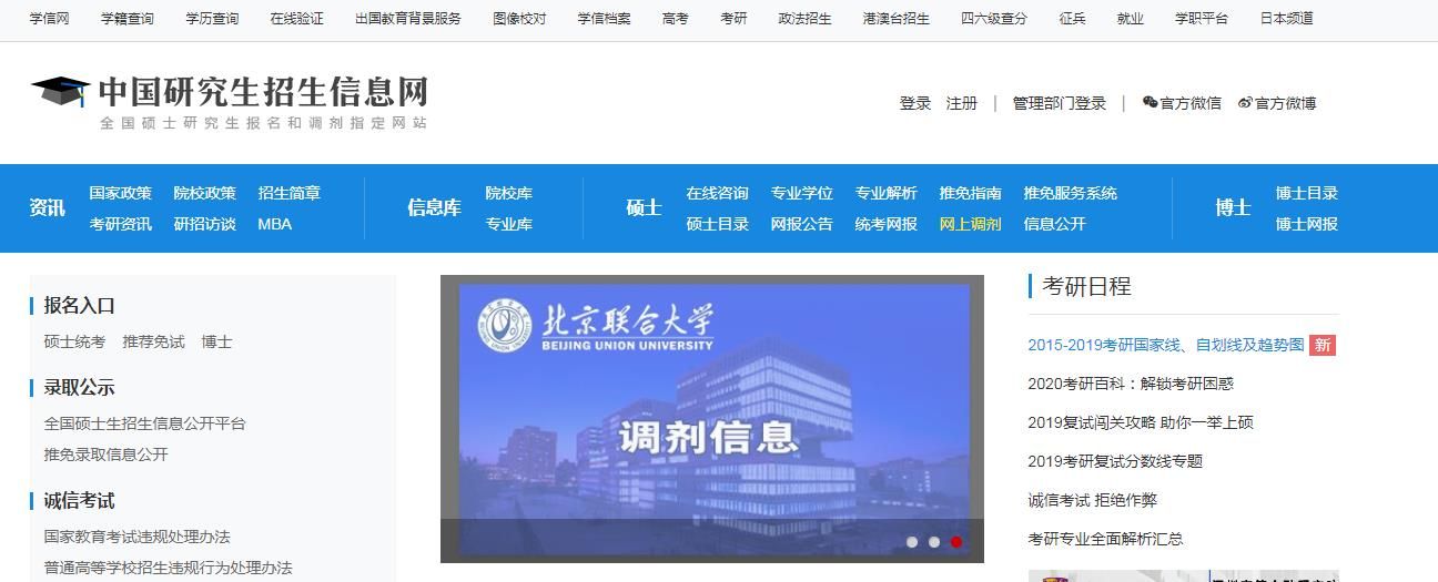 中國(guó)研究生招生信息網(wǎng)是隸屬于教育部的以考研為主題的官方網(wǎng)站,是教育部唯一指定的研究生招生考試網(wǎng)上報(bào)名及調(diào)劑網(wǎng)站,主要提供研究生網(wǎng)上報(bào)名及調(diào)劑、專業(yè)目錄查詢、在線咨詢、院校信息、報(bào)考指南和考試輔導(dǎo)等多方面的服務(wù)和信息指導(dǎo)。